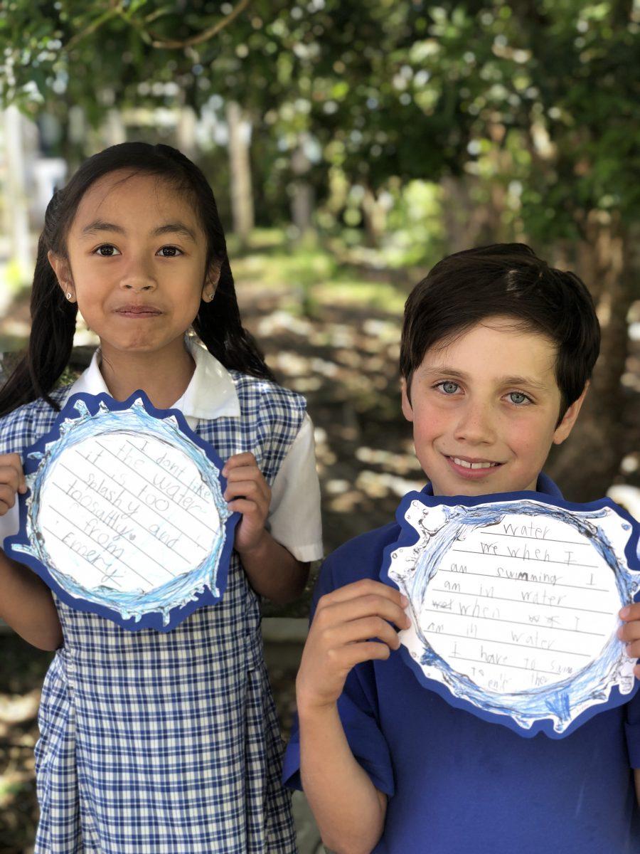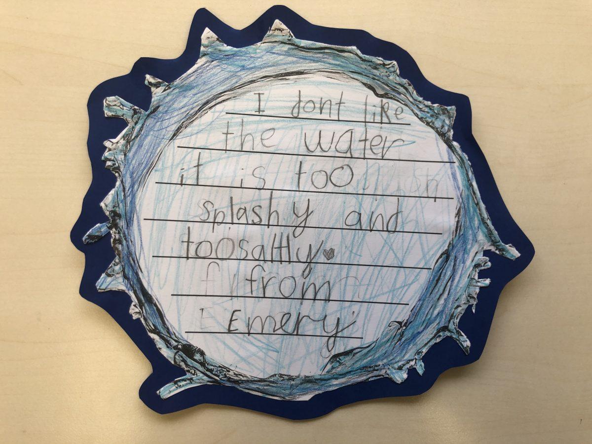 We decided to do some writing drawing on our experiences at swimming this year, so the children were given the opportunity to do some free-writing or poetry to express their ideas. Children wrote about water, swimming caps and goggles, all of which became old friends during their swimming lessons. Some children really showed an understanding of how language not only provides enjoyment but can also be a vehicle whereby they develop their own personal voice and identity. The children were given guidance to create their responses but were also allowed free reign to express themselves as they wished.